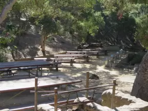 A rugged wilderness area in a canyon, with rows upon rows of picnic tables for large gatherings.