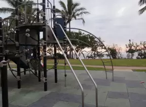 Sweet little beach with steep golden sand, shallow calm water, and a great playground and park full of people!