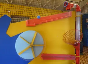 Attractive children's museum with market and carts, Newton's playhouse where you can shoot balls, ball pit, fire engine, oak tree tunnels, stage, dress-up area, and pizza kitchen.