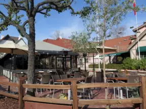 Trendy area with coffee shop, beer garden, wine bars, and cider bar, in industrial-style architecture with murals.