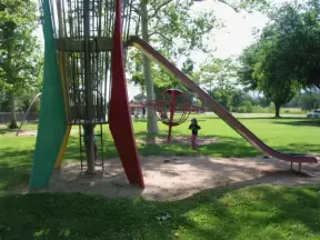 A large park with beautiful tall trees, playground with huge slides, gazebo, and a pleasant lake where you can rent paddle boats in summer.