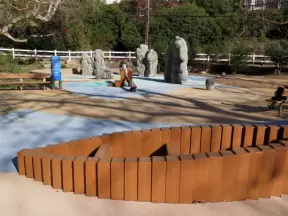 Cement ship playground with logs to climb, seal, dolphin, whale's tail and giant octopus sculptures, picnic tables, and an amazing view of Morro Rock and the inlet.