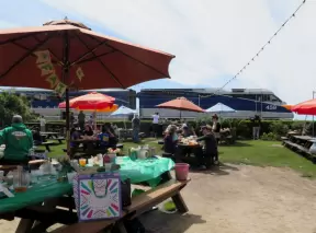 Upscale, colorful plaza in farmhouse style, with modern cafes. Kids climb on a huge log. The fire pit is fantastic at night, surrounded by eucalyptus trees.