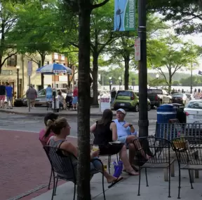 Cute area with outdoor cafes, flower boxes, church steeple with chimes, and village green where family events such as movie night or games night are held.