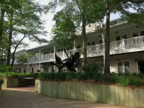 Shopping plaza with large trees and colorful architecture. Nice cafes and shops.