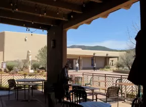 Upscale, colorful plaza in farmhouse style, with modern cafes. Kids climb on a huge log. The fire pit is fantastic at night, surrounded by eucalyptus trees.