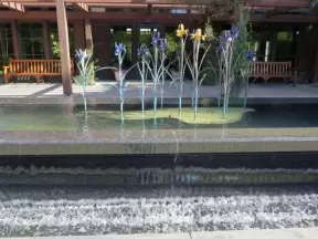 Unique redevelopment complex with man-made river, bee hive behind glass, colorful decorations, live music, and a few restaurants.