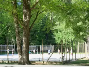 Running trails under incredible tall trees, large playground, and tennis, racquetball, volleyball and basketball courts.