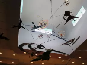 Incredible glass building with interesting activity stations for kids and modern art for parents.