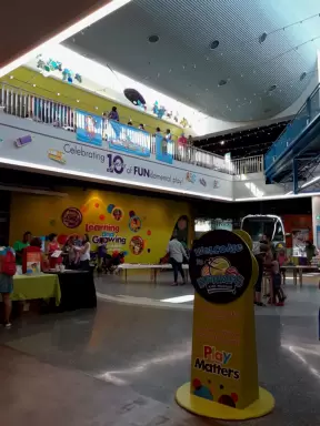 An attractive indoor mall with carousel, candy store, toy store, tropical food court, and play area for kids.