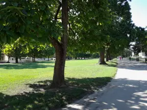 Park with playground surrounded by tropical plants and trees, lawn bowling, and putting green in the center.