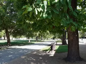 Lively park with long winding walking paths, tennis courts, sports fields, playgrounds, archery range, and aquatic center.