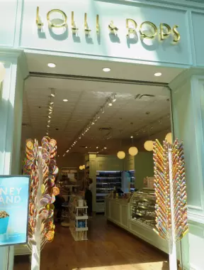 Outdoor mall with movie theater, cafes with atmosphere, candy shop, and more.