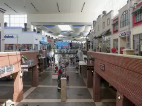 Beautiful indoor two-level mall with ritzy shops, upscale chain restaurants, and a food court.