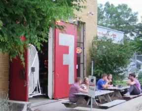 A trendy street in the middle of a sketchy neighborhood, with cafes and colorful graffiti-covered walls.