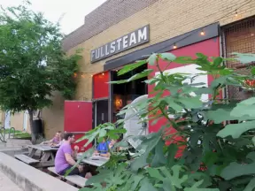 Health food store with great bakery, indoor seating with big windows, and outdoor picnic tables under thick leafy shade.