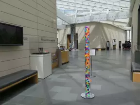 Incredible glass building with interesting activity stations for kids and modern art for parents.
