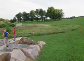 Two-mile paved walking loop around lake, in forest and open fields, past geese and bald eagles.