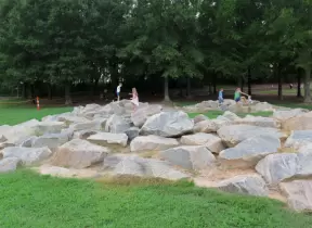 Memorable park with long cable to zipline on, and water play area you pump water into. Many trees, and benches for parents.