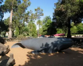 Modern playground with Chumash Indian huts and canoe, seals and whales to climb, roller slide, rainbow bridge, and bald eagle in a nest.