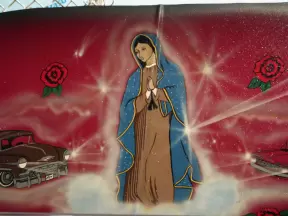 White-washed church with bell towers, rose window, Mary and contented baby Jesus sculpture.