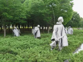 Memorial full of atmosphere, with statues of soldiers rising out of the juniper bushes.