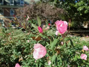 Spanish mission from late 18th century, in downtown San Luis Obispo, with giant roses in the garden behind and a lively plaza in front.