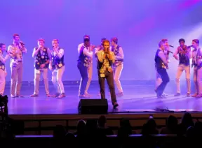 Hotel inside a giant atrium with tropical plants, fish, alligators, and decorations. ICE sculpture event in December.