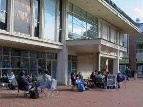 Historic buildings, sunny quad where students hang out, flowers and old trees, and fun student center area.