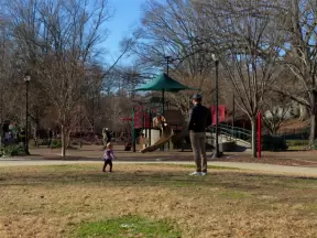 Large shady playground with fun three-person spinner swing. Bolin Creek bike path starts here.