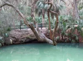 A beautiful park with jungly trees and a milky green spring to view. Amazing drive along the water too.