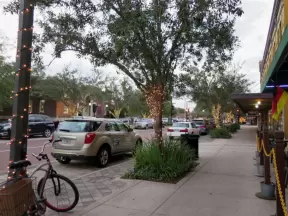 Main strip of West Palm Beach, with colorful and inviting architecture and decorations.