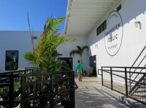 Shopping plaza with a deck offering lots of attractive public space, a trampoline for young kids, a sky deck bar, a dark public market with lights, cafes, stores and coffee shops.