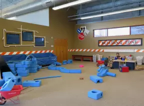Attractive children's museum with market and carts, Newton's playhouse where you can shoot balls, ball pit, fire engine, oak tree tunnels, stage, dress-up area, and pizza kitchen.