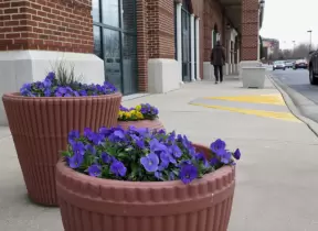 A pretty mall filled with flower pots and giant sized games, with views of the mountains and plenty of stores for kids!