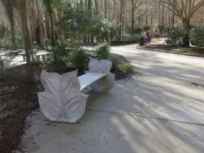 Popular 1.7 mile loop walking path with some shade and wooden boardwalk beside the river.