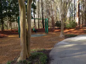 Running trails under incredible tall trees, large playground, and tennis, racquetball, volleyball and basketball courts.