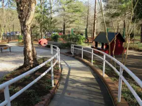 Lovely playground in a recessed forest area, with a greenway connecting to another great playground.