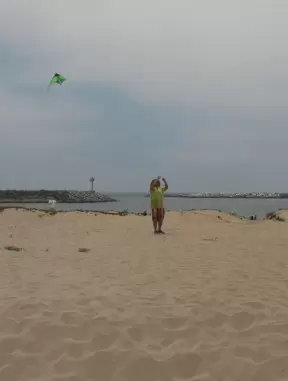 A glorious beach in Grover Beach town, with sand dunes and a wooden boardwalk, plus an octagon-shaped wooden pier in the sand.