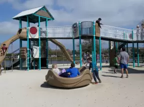 Incredible playground with so much play equipment! Jogging path, ducks on pond, huge skate park, and modern cafe as well.