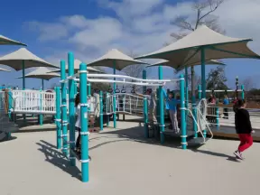A huge wonderful park with a new playground that is out of this world, a lake with paddle boats, and plenty of trees and grass.