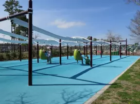 Large field with sweeping views, playgrounds, workout stations, picnic pavilions, and walking path around the field.