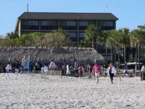 Whitest white sand, clear sparkling water, spacious green lawns with large shade trees, tropical flowers, a wide half-mile boardwalk, and a huge park full of tropical plants.