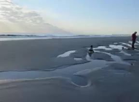 Beach with pretty dunes, slightly grody shoreline, and great walk to jetty.