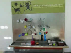 Incredible glass building with interesting activity stations for kids and modern art for parents.