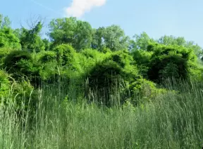 Paved greenway with tall trees that leads to Merritt's Pasture, a field. Stinky sewer in summer.