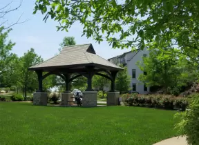 Town with splash pad on the lake, town square with cafes, playground, and lots of stores.