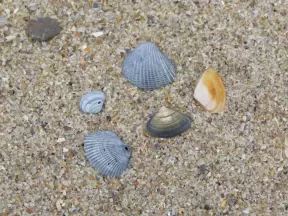Wide-open beach with pale grey sand, shells on the shore, and aquamarine water, across from a playground, turtle center, and hike.