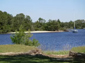 Peaceful spot with nice sand (great for building), blue water (from a distance), the sound of water lapping the shore, green lawn, playground, and trees for shade.