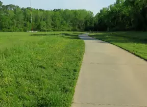 Paved greenway with tall trees that leads to Merritt's Pasture, a field. Stinky sewer in summer.